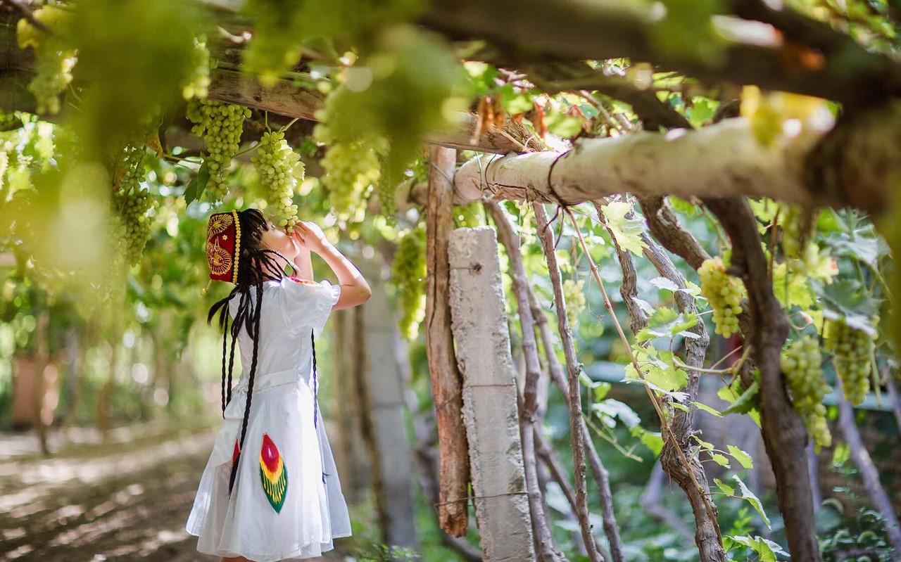 Los puestos se alinean junto a las vides,ofreciendo uvas frescas,frutos secos y especialidades locales como el cordero asado y el pan naan.