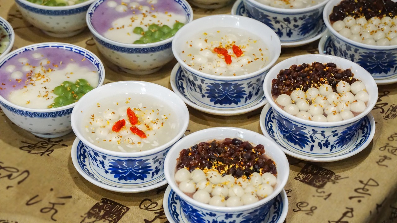 Tangyuan : Bolas de arroz glutinoso rellenas,a menudo de pasta de sésamo negro. La Tienda de Bolitas de Arroz Ningbo es excelente.