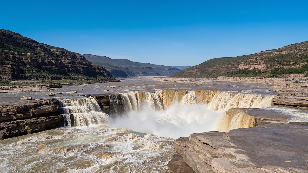 Las Cataratas Hukou,donde el poderoso Río Amarillo se estrecha y se desplaza, presentan el espectáculo más grandioso de su tipo. El rugido del agua se puede escuchar a kilómetros de distancia,y el rocío se eleva como humo.
